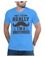 Bartender Print Blue Cotton T-Shirt with Cool Mustache Design