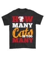 Express your love for felines with this humorous black cotton tee. Featuring “How Many Cats Is Too Many” with a playful cat graphic, it’s perfect for cat owners and animal lovers. Made from soft, breathable cotton for comfort.